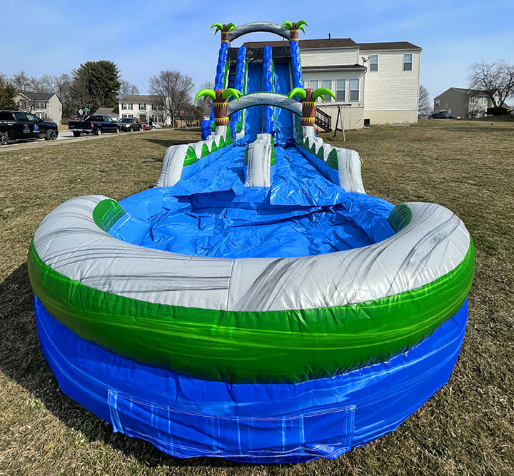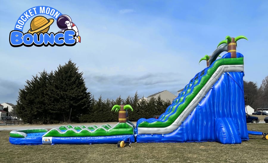 Looking to turn your backyard into a tropical oasis? Our Tropical Paradise Water Slide is just what you need! This 22-foot tall water slide with a slip and slide attachment is perfect for cooling off on a hot summer day. It's our longest and most popular slide, guaranteeing hours of fun for kids and adults alike.